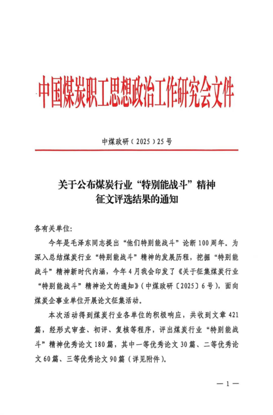 今年正值毛泽东同志提出“他们特别能战斗”重要论断100周年。为深入总结煤炭行业“特别能战斗”精神的百年发展历程,挖掘其新时代内涵,中国煤炭职工思想政治工作研究会组织开展了2025年度煤炭行业“特别能战斗”精神论文征集活动。