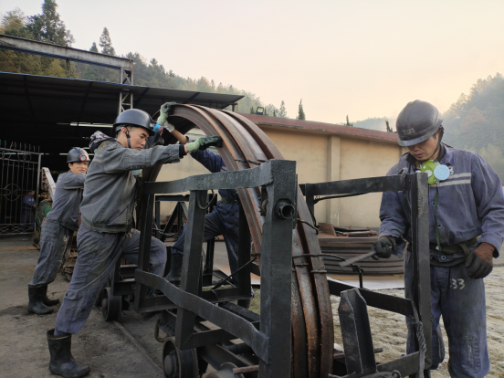 为加快推进仙亭煤矿 500m~ 660m总回风巷施工进度,该矿全面强化后勤保障,在做好物资供应的基础上,及时协调解决队伍施工过程中遇到的难点与堵点问题。图为近日,工作人员正在装运一批经特殊加工的工字钢棚。(陈先臻 摄)